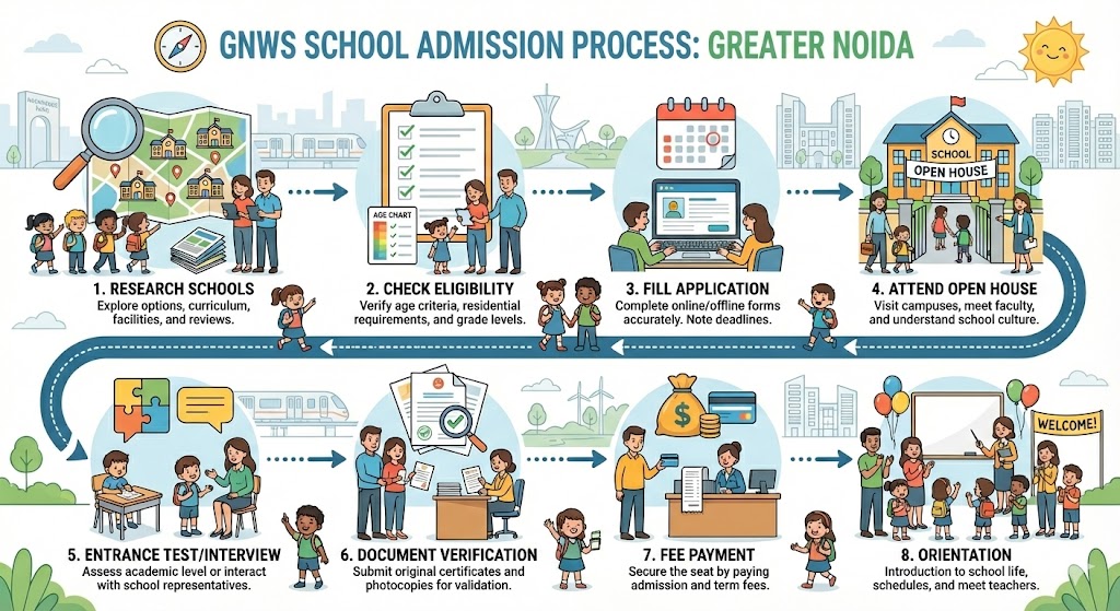 Navigating the school admission process in Greater Noida becomes easier when parents follow a structured approach. Researching schools in Greater Noida, understanding eligibility criteria, attending open houses, completing entrance assessments, and submitting required documents are essential steps.