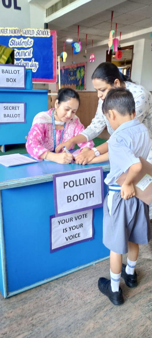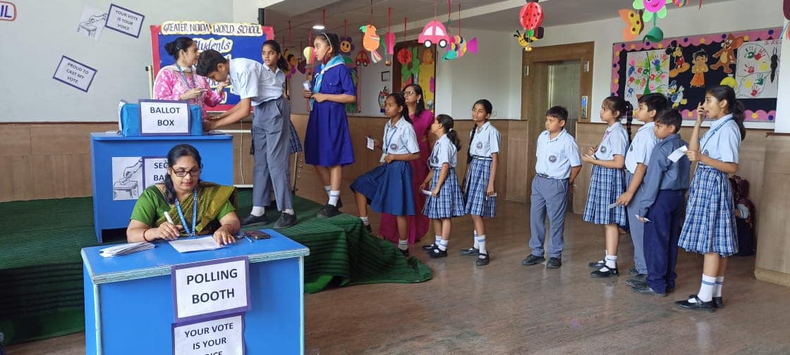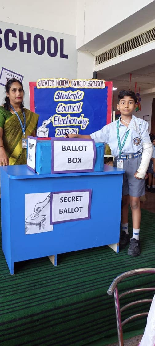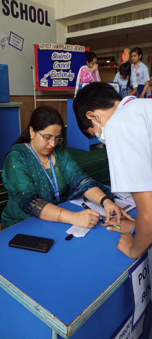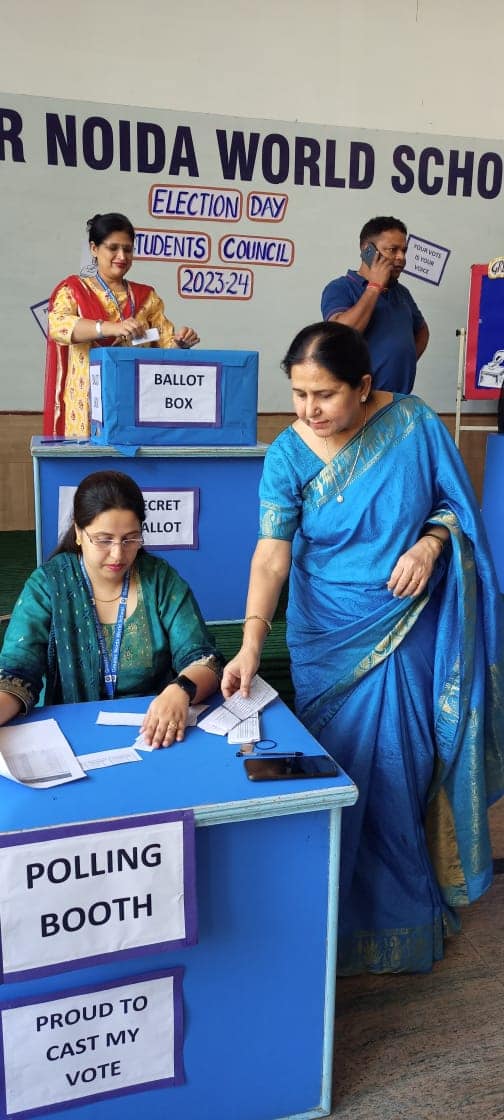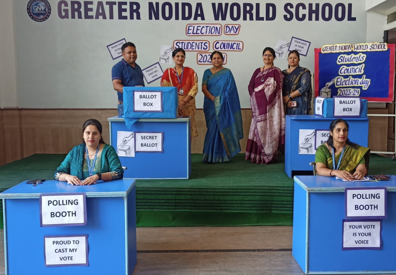 Greater Noida World School organized "Student Council Elections" for the academic session 2023- 24 under the supervision of our esteemed Principal Mrs. Manju Kaul Raina as the Election Commissioner. The election was conducted by the Electoral Literacy Club of the school under the able guidance of Vice Principal and the teachers of the club. The team of teachers played the role of polling officials and monitored the smooth conduct of elections in a democratic manner. The teachers as well as students were equally enthusiastic about the event by which the Head Boy, Head Girl, Vice Head Boy ,Vice Head Girl of senior and junior wing both are elected. The contestants were asked to nominate themselves for taking part in the elections a few days prior to the final day of the voting. These nominees presented their manifestos in front of their Class-mates. The students from classes IV to XII participated in the polling.The newly elected Student Council will be administered the oath by the Principal ma'am in the Investiture Ceremony which will be held in July, 2023.